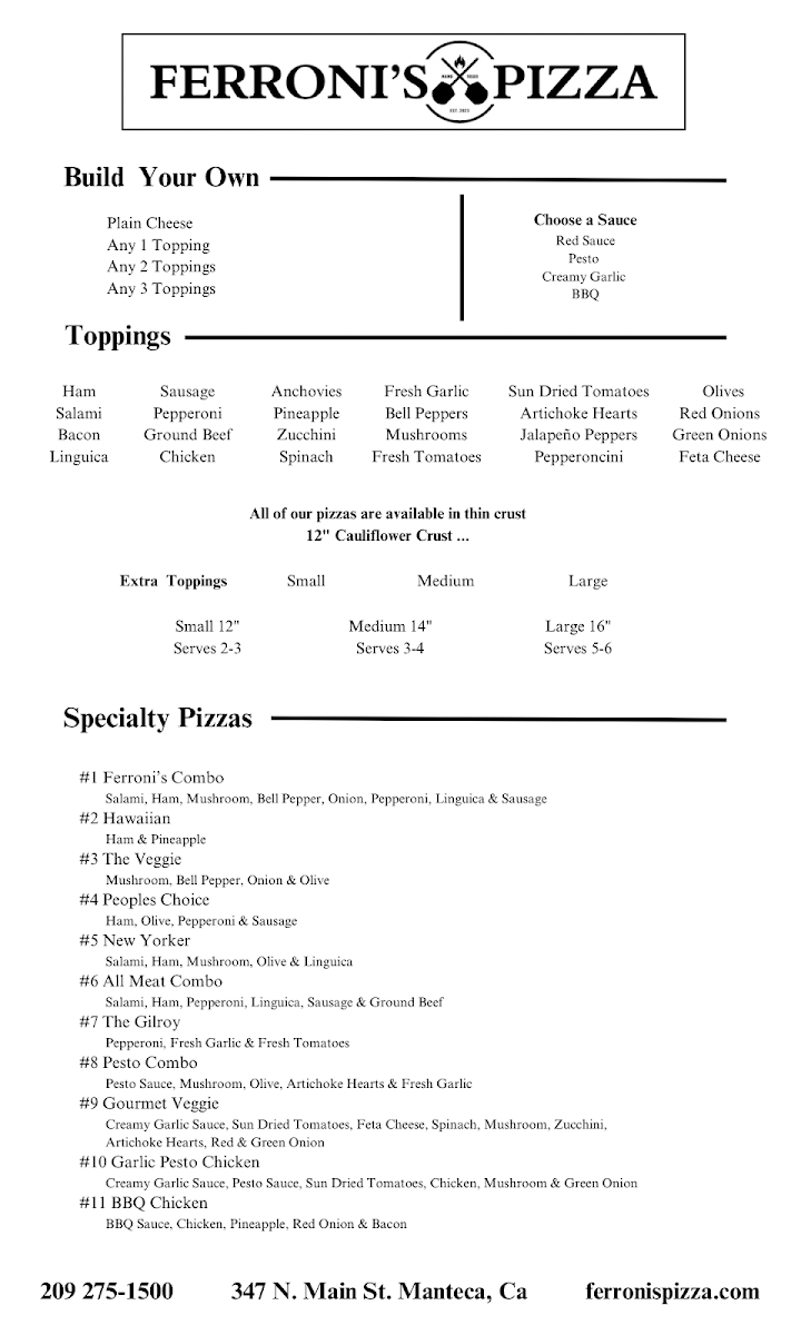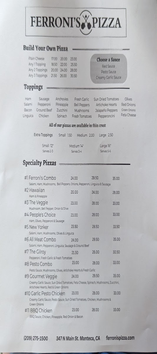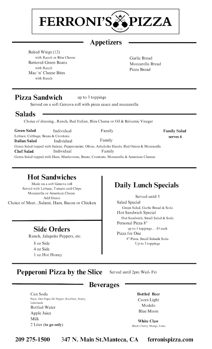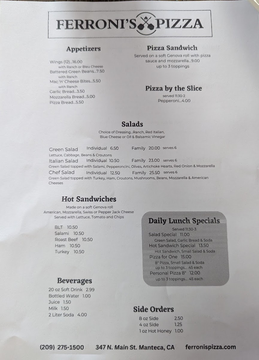 From a reviewer’s perspective, Ferroni’s Pizza at 347 N Main St offers a menu that balances classic comfort foods with customizable options. The Hot Sandwiches, including BLT Sandwich, Ham Sandwich, and Salami Sandwich, pair well with starters like Garlic Bread, Mozzarella Bread, Battered Green Beans, Pizza Bread, and Mac 'N' Cheese Bites. For those looking for variety, the Side Orders such as 8 Oz Side, 1 Oz Hot Honey, and 4 Oz Ranch complement the main offerings. Pizza lovers can choose from Large 16" Pizzas like #5 New Yorker (Large), #7 The Gilroy (Large), #3 The Veggie (Large), #6 All Meat Combo (Large), or a Large Build Your Own. Medium and small pizzas, including #10 Garlic Pesto Chicken (Medium) and #11 BBQ Chicken (Small), give flexibility for different appetites, while Pizza by the Slice and Pizza Sandwich offer quick, casual options. The menu also includes fresh Salads such as Green Salad, Italian Salad, Caesar Salad, and Chef Salad, and lunch specials like Personal Pizza, Hot Sandwich Special, and Salad Special make weekday dining convenient. Beverages range from Can Diet Pepsi to Modelo and Blue Moon, ensuring a drink for every preference. Overall, Ferroni’s Pizza presents a menu that is approachable yet diverse, with options for both hearty meals and lighter bites, making it a solid choice for Manteca diners.